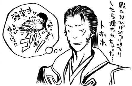 慶次!デカい!慶次!ムッキムキ!と頭の中で叫びながら描いたら佐吉との体格差が酷い事になりましたねハハハ。