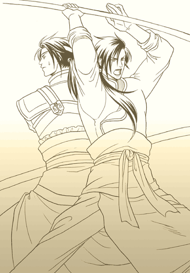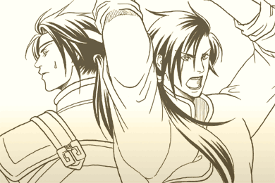 鋤や鍬で戦う胆兄と正統派竜胆で戦う胆。